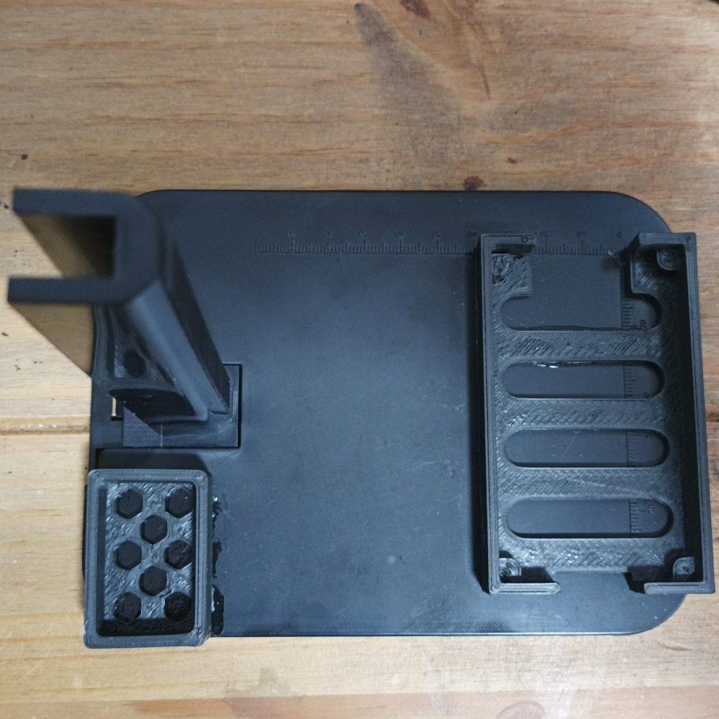I also wanted the board to stay still whilst being filmed. I’ve previously used bluetak for filming but as I wanted to show both sides of the board that could have been troublesome. So I opened up FreeCad and created a tray for the board. And whilst I was at it, I also created a tray for the USB hub which would allow it to stand vertically next to the microscope stand. I added lots of holes to both to allow it to print a bit quicker and to reduce warping. This should also make it easier to remove at a later date as less surface area is glued.