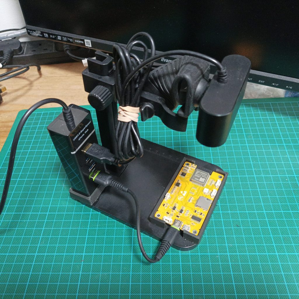 I did have a desktop USB microscope but when I experimented with that it was only showing part of the board and was magnified rather too much. However the stand for the microscope was just the right size for my purpose and I realised that could be used with a regular webcam. I’d used a webcam with an overhead camera rig previously and knew that it could be focused quite close by unscrewing the lens slightly. I’ve also experimented with smart phone macro lenses for this although it wasn’t needed in this case.